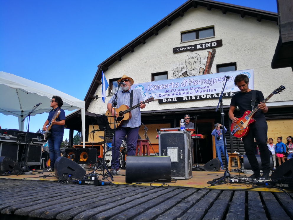 Il ritorno di Eugenio Finardi a Sportinia è stato un successo. C’era attesa per questo concerto che nel 2015 iniziò ma poi fu annullato per maltempo. Questa volta il tempo è stato splendido e Finardi ha potuto ricambiare con due ore di canzoni e musica l’affetto del pubblico. Un colpo d’occhio ancora una volta incantevole nella splendida conca di Sportinia con migliaia di persone comodamente accomodate nella conca naturale dinanzi a Capanna Kind. E così anche quest’anno il grande concerto di Ferragosto delle Montagne Olimpiche (giunto alla sua 14° edizione), fortemente voluto dal Comune di Sauze d’Oulx con l’Unione dei Comuni Olimpici della Via Lattea ed organizzato dall’associazione Lucas con la direzione artistica di Roberto Beccaria, è stato un successo. Eugenio Finardi non si è risparmiato e ha ripercorso tutta la sua quarantennale carriera accompagnato da una grande band costituita da Giovanni “Giuvazza” Maggiore alle chitarre, Claudio Arfinengo alle percussioni, Marco Lamagna al basso, e Federica Finardi Goldberg al violoncello. In apertura di concerto il sindaco di Sauze d’Oulx Mauro Meneguzzi ha voluto ricordare le vittime del crollo del Ponte Morandi di Genova e l’ex assessore al turismo di Sauze Vincent Hawkins prematuramente scomparso e per tutti il grande applauso del pubblico di Sportinia. A portare il saluto dell’Unione dei Comuni Olimpici Vialattea è stato il presidente Maurizio Beria, sindaco di Sauze di Cesana.
