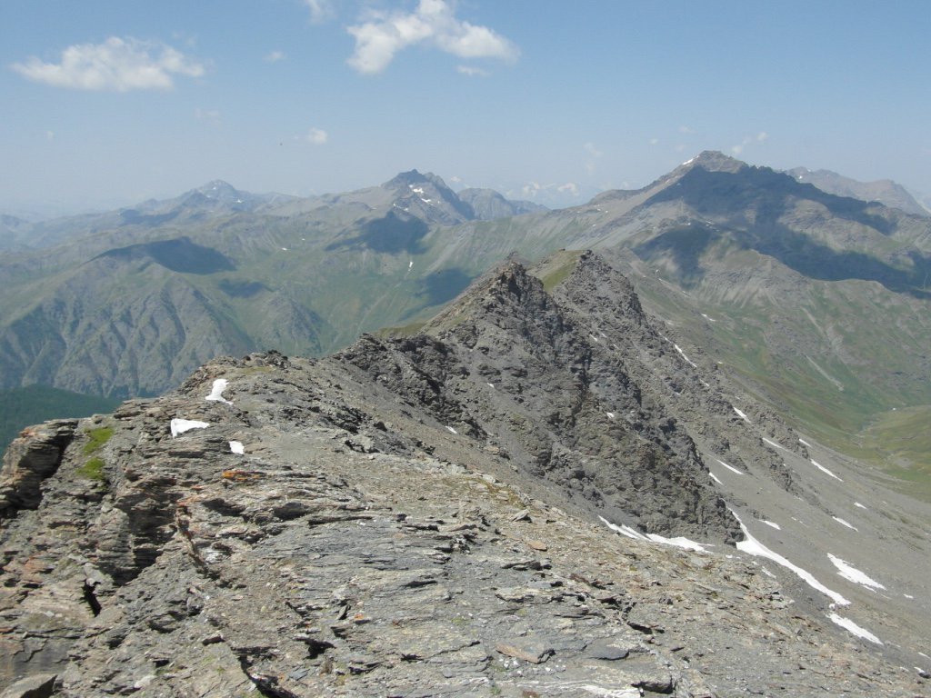 Seguiamo il sentiero a dx in direzione del passo Frappier m. 2891. e dopo circa 200 metri, pieghiamo a sx per tracce sino a raggiungere in poche minuti la cima Frappier m. 3003. Per un buon sentiero, seguiamo la cresta - a tratti esposta sul versante val Germanasca - raggiungendo il passo Frappier. Un buon sentiero e ometti di pietra, in circa 30 minuti ci portano facilmente sulla vetta del Gran Queyron a quota 3060, dove lo sguardo si ferma ad ammirare l'incantevole spettacolo delle vallate sottostanti. 3.30 h di buon passo per la salita di entrambe le cime.