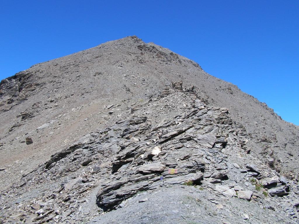 Da questo punto, su traccia ripida ma camodamente camminabile che percorre l'ampio crestone detritico, si raggiunge la cima del Pelvo (croce metallica).